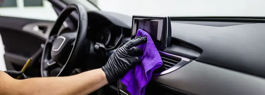 Vacuum floors, seats, and trunk area Wipe down vinyl or plastic floor mats Wipe leather seats down Clean console, cup holders, crevices and vents Clean dash Clean all interior trim and plastics Clean and condition door panels and pockets Clean door jambs Clean glass inside and out Steam clean if applicable Shampoo and extract carpets and seats if applicable